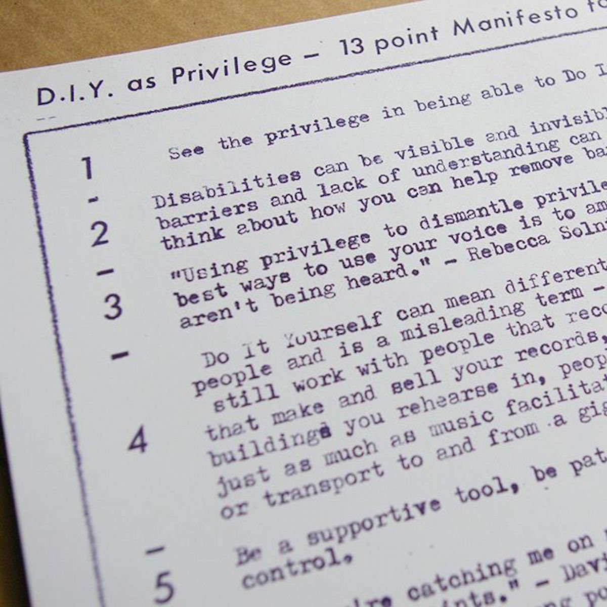 'DIY AS PRIVILEGE - 13 POINT MANIFESTO FOR MUSICIANS as privilege is talked about a lot within DIY and punk and I think being able to Do It Yourself is a massive privilege which isn’t always recognised - and if you’ve got privilege you can use it to help other voices to be heard '